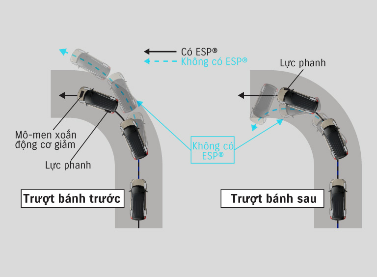 Nếu xảy ra hiện tượng trượt bánh, hệ thống sẽ tự động điều chỉnh công suất động cơ và phanh để kiểm soát hiện tượng trượt bánh, đảm bảo xe luôn vận hành theo quỹ đạo mong muốn.